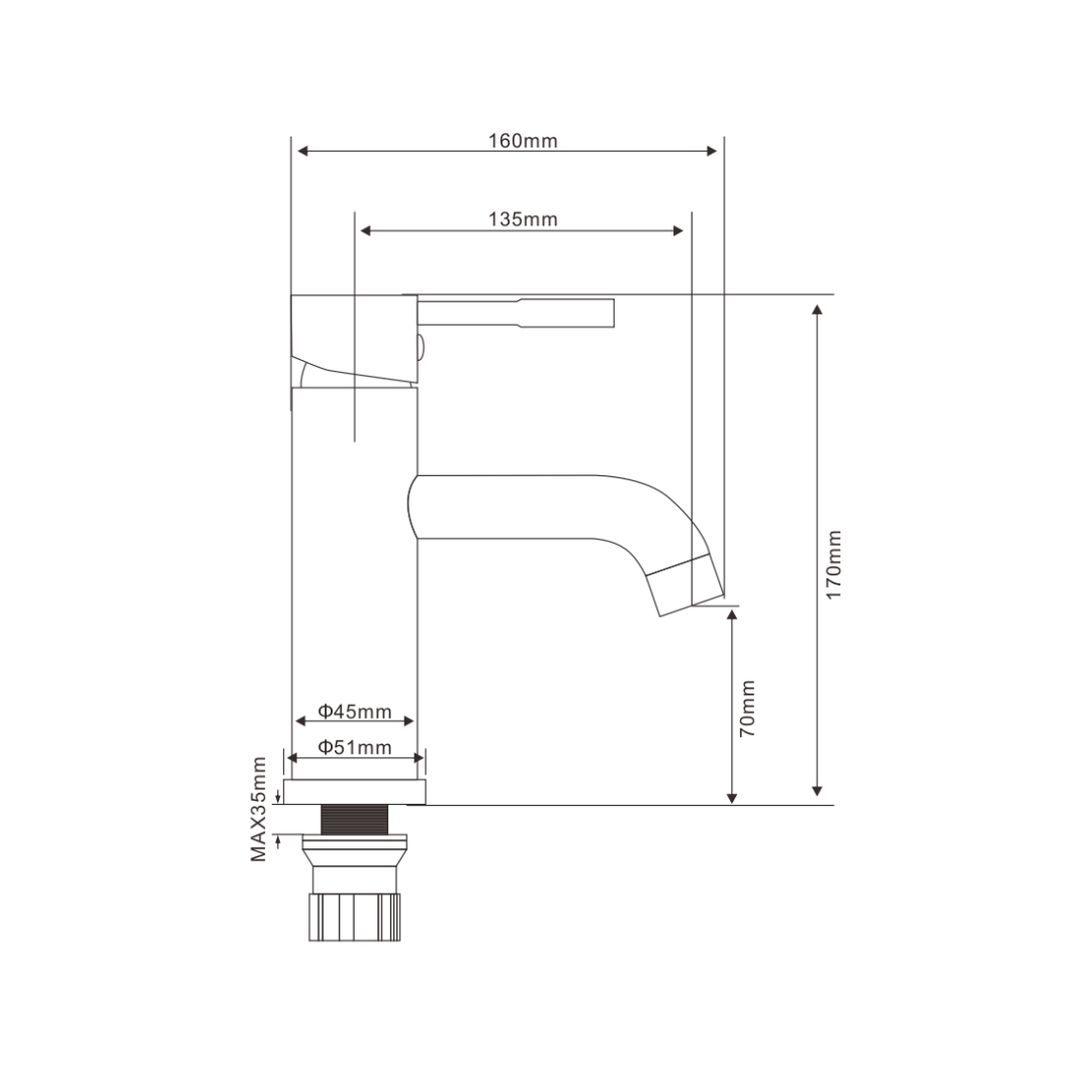 Смеситель для раковины AKERO, выполнен из прочной и долговечной нержавеющей стали SUS 304, устойчивой к коррозии и механическим повреждениям. Его гладкая поверхность приятна на ощупь и легко чистится. Размеры смесителя обеспечивают удобство использования и комфортный напор воды. Длина излива — 135 мм, что оптимально для большинства раковин. Диаметр основания составляет 51 мм, обеспечивая устойчивое положение смесителя.