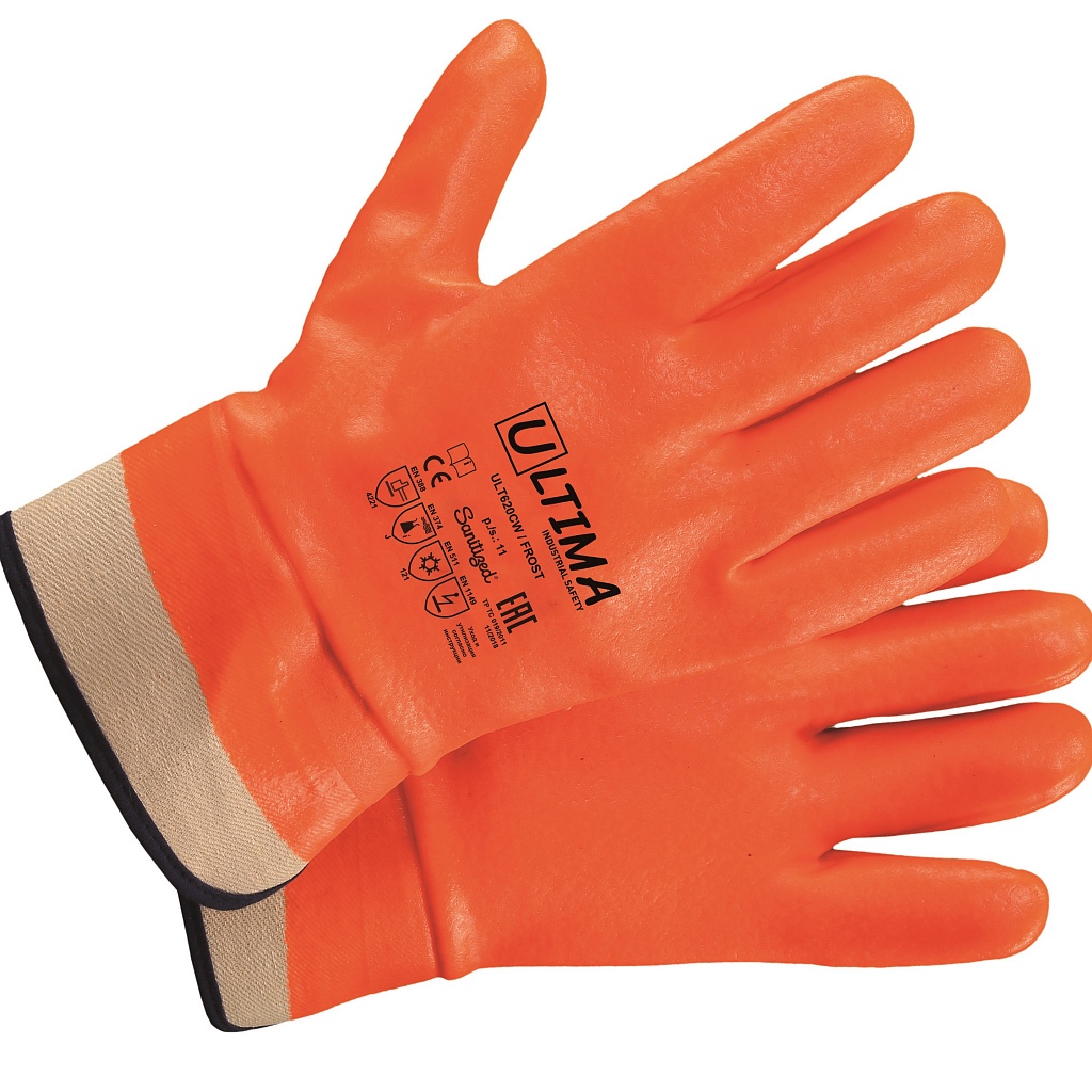 3. Перчатки ULT620CW с двойной ворсистой основой из 100 % хлопка «джерси». Жесткая крага из парусины. Морозостойкое ПВХ покрытие, шероховатая поверхность. Сигнальный оранжевый цвет обеспечивает дополнительную безопасность во время работы. Длина 29 см. Размеры 10, 11. Предназначены для всех видов работ, связанных с механическими нагрузками, контактами с нефтью и продуктами нефтепереработки в условиях пониженных температур в различных отраслях промышленности.
